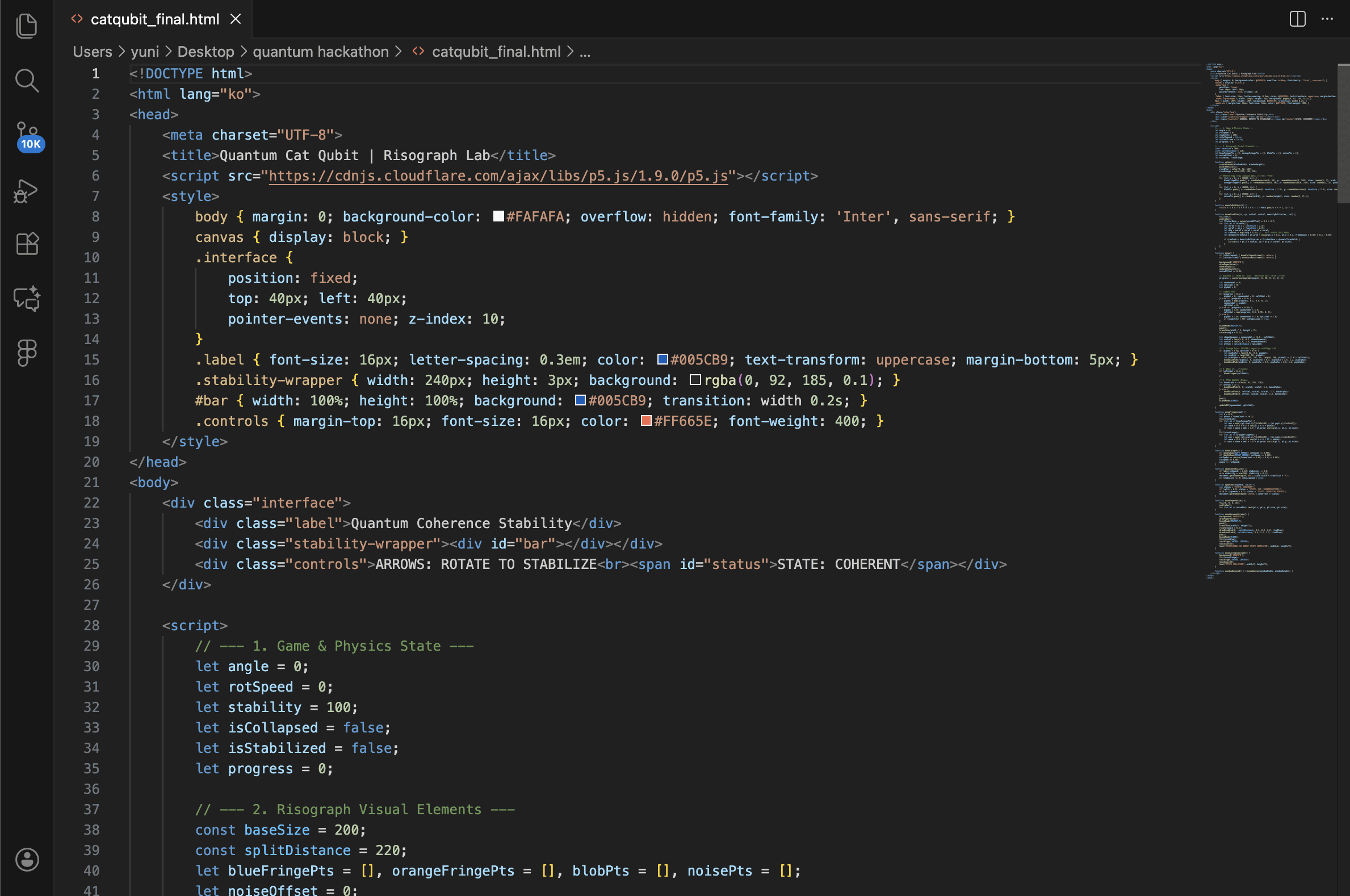 Our team focused on the 'Cat Qubit'. After brainstorming with physicists, we developed a game where players use arrow keys to manually stabilize a rotating quantum state. This mechanic simulates how quantum hardware is engineered to fight its own errors (Active Error Correction).