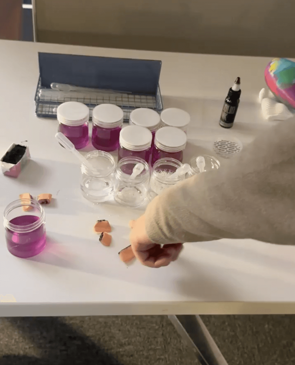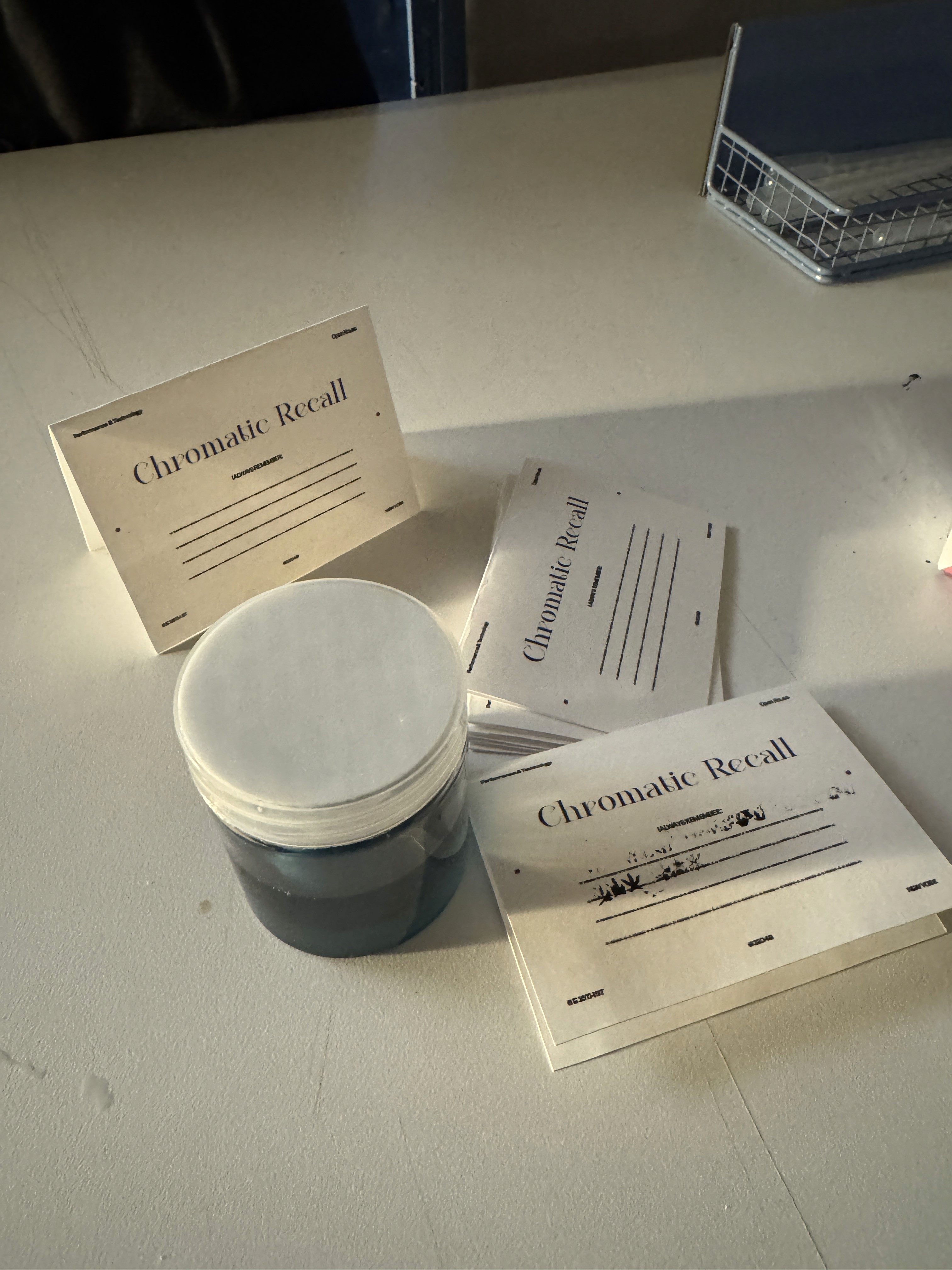 The resulting color is placed into a small container that participants can take with them, functioning as both a physical sample and an artifact of the memory.