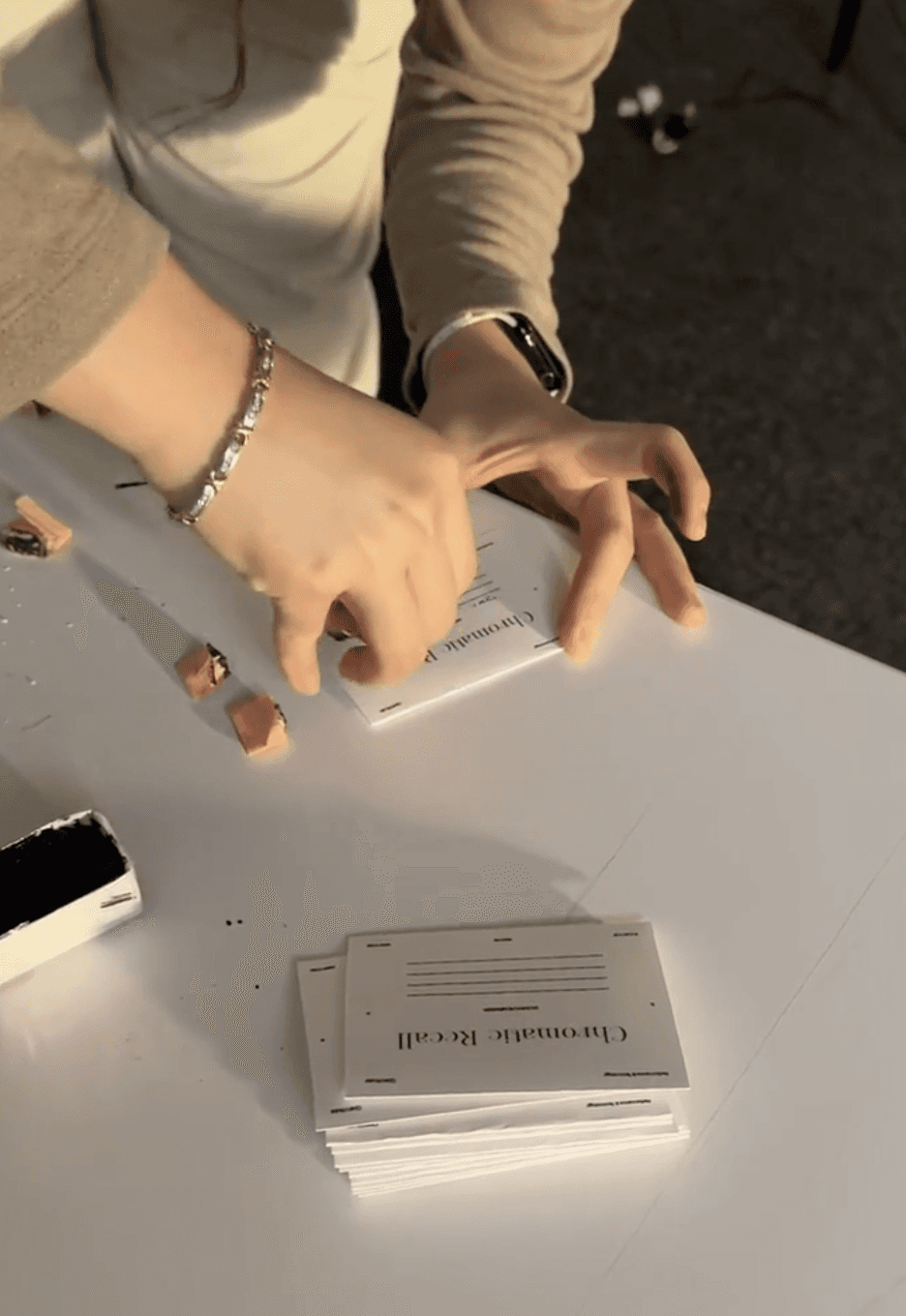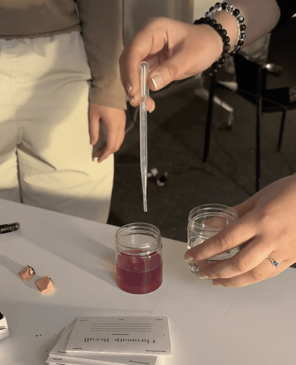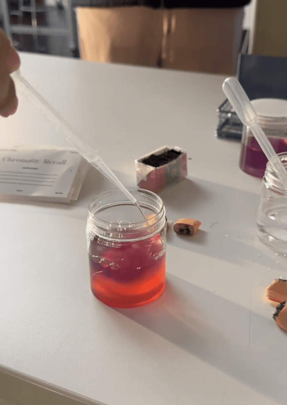Participants follow the receipe protocol and mix the solutions themselves. Through this process, a color is generated and treated as the physical translation of the emotional state of the memory.