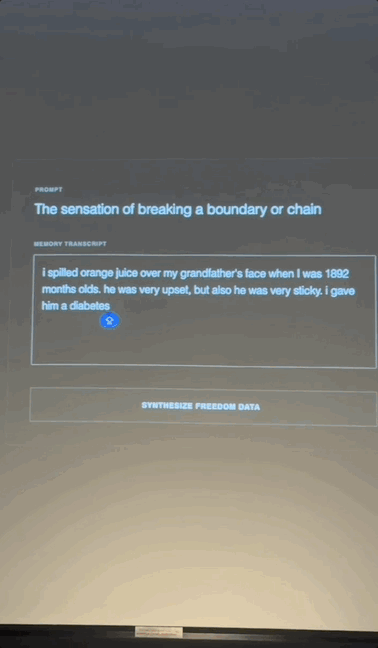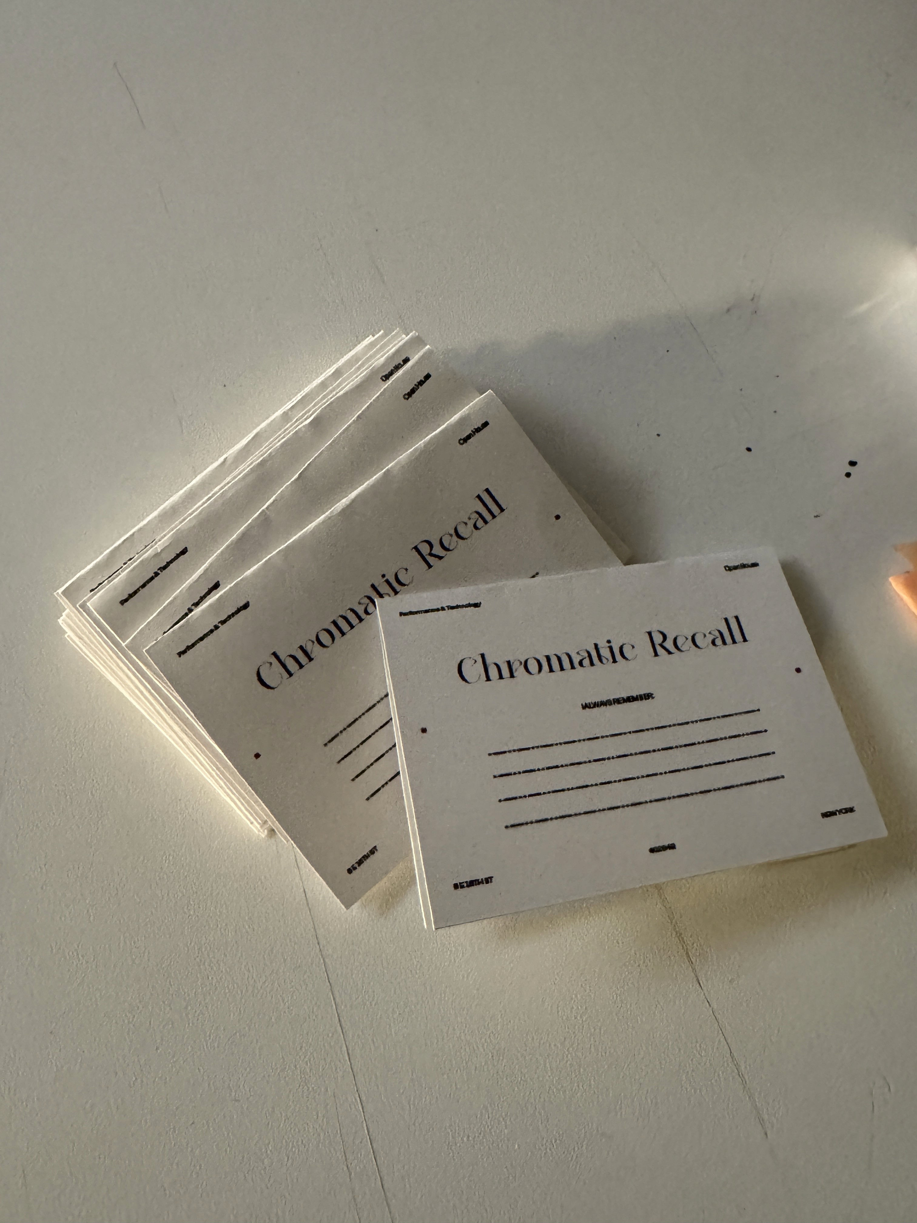 This project is an interactive experimental work in which a participant inputs a personal memory, the emotional characteristics of that memory are analyzed, and a color is extracted and physically generated through a liquid reaction that the participant can take away.